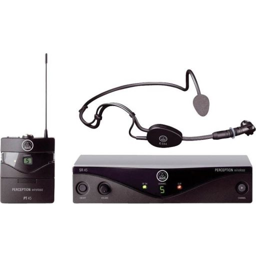 Tartozék: AKG C544L fejmikrofon, AKG PT-45 zsebadó, AKG SR-45 vevő, AKG W-444 mikrofon szivacs, AA ceruzaelem, SMPS kapcsoló üzemű hálózati adapter