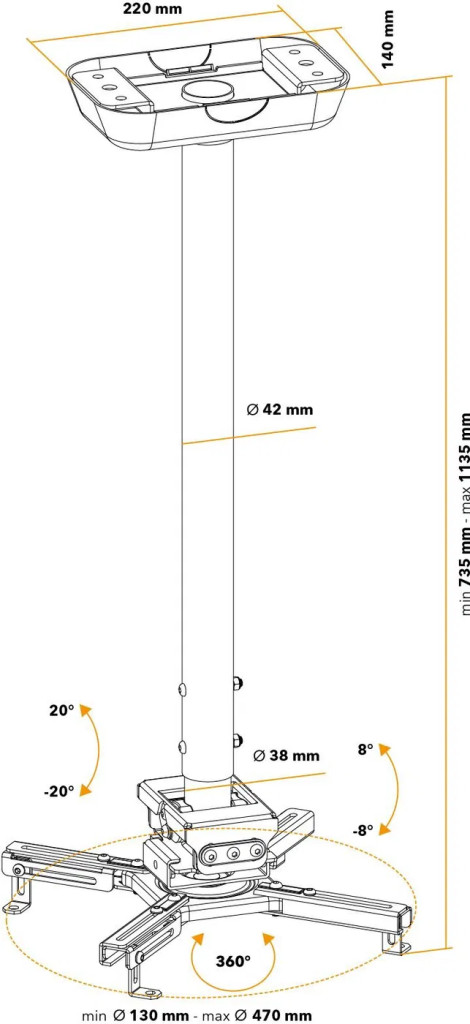 Az AlzaErgo C22B Advanced Ceiling Mount projektor tartóval egyszerűen felszerelheted projektorod tantermekben, tárgyalókban, vendéglátóhelyiségekben és más helyeken, ahol prezentációkat vagy videókat vetítenek. A tartó szerkezete hidegen hengerelt acélból készült, ami által rendkívül tartós és ideális a legfeljebb 35 kg tömegű hagyományos projektorok felszereléséhez. Kellemes előnye a beállítható magassági tartomány 735–1 135 mm között.