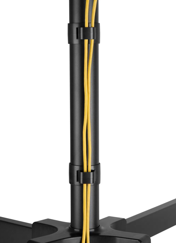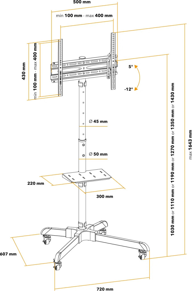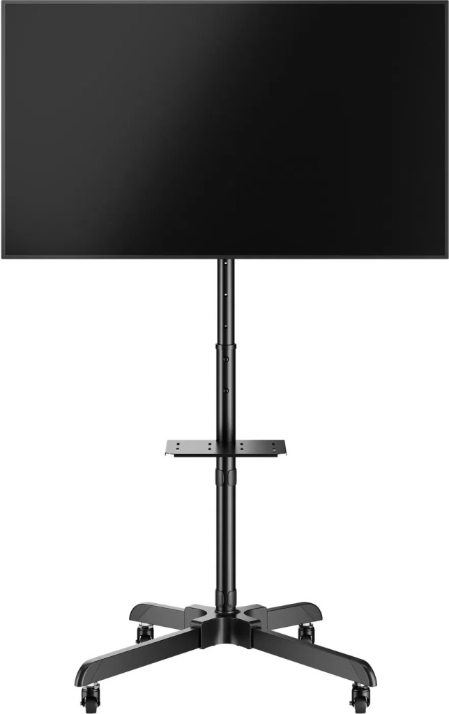 TV állvány - 32" - 55", szabadon álló, VESA 100×100, 200×100, 200×200, 300×300, 400×200, 400×400, tartó terhelhetősége: 35 kg, polc terhelhetősége: 5 kg, dőlés: -12° / +5°, 6 fokban állítható magasság 103 és akár 143 cm között, kábelrendező rendszer, görgők reteszelő mechanizmussal