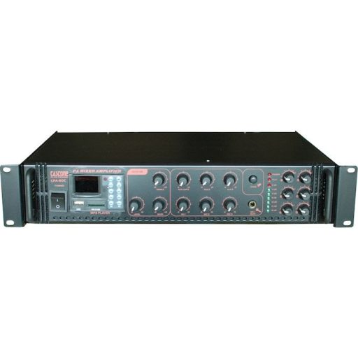 Az előlapon található a MIC1 bemenet, minden csatorna független hangerő szabályozója, a közös mély és magas hangszínszabályozók és a LED sorból álló kimeneti jelszintmérő, továbbá a hibát jelző LED (PROTECT)