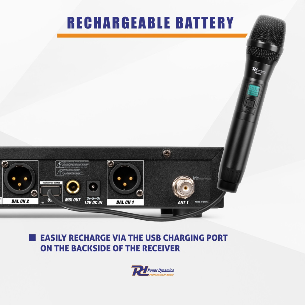 – Beépített USB tápegység a mikrofon akkumulátorainak töltéséhez