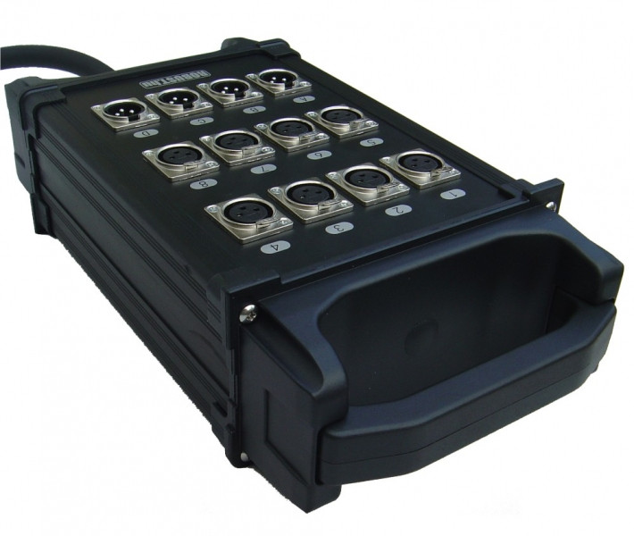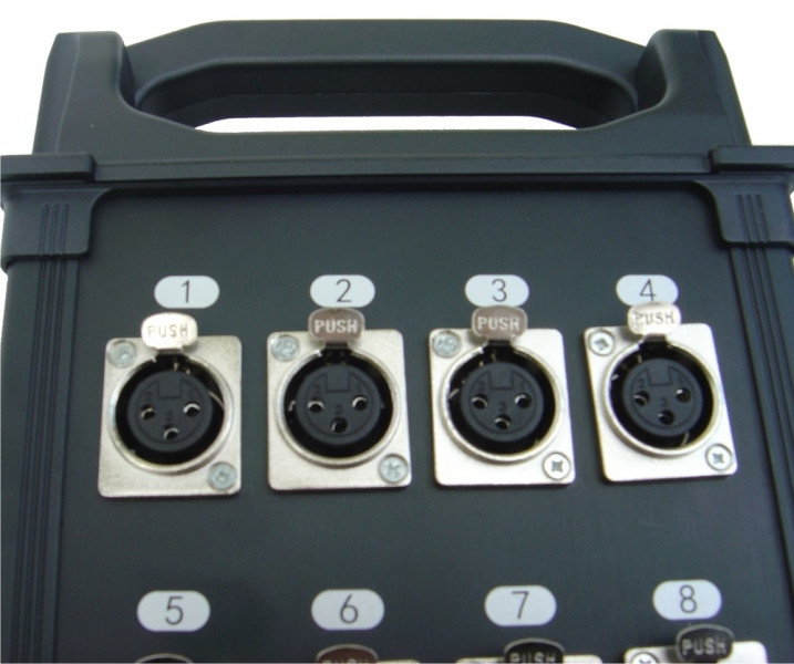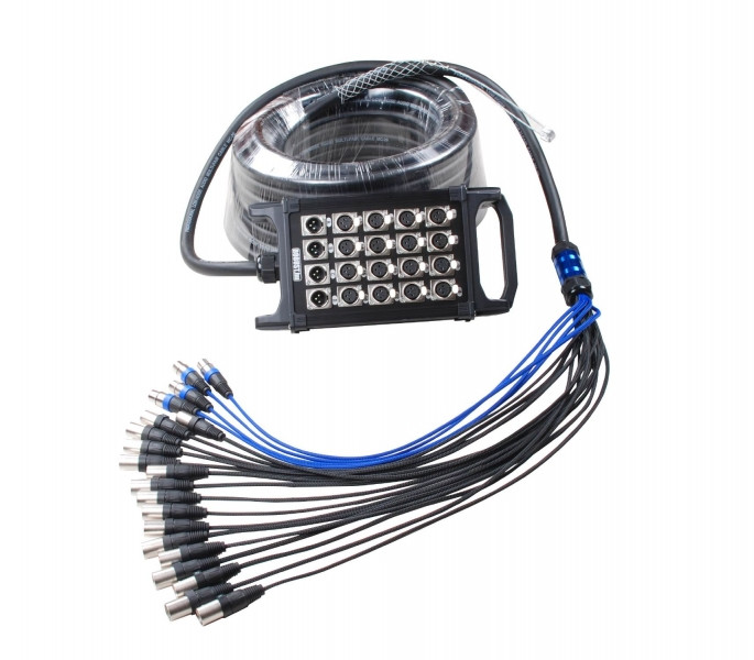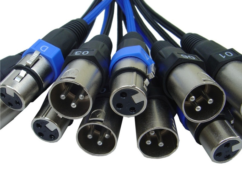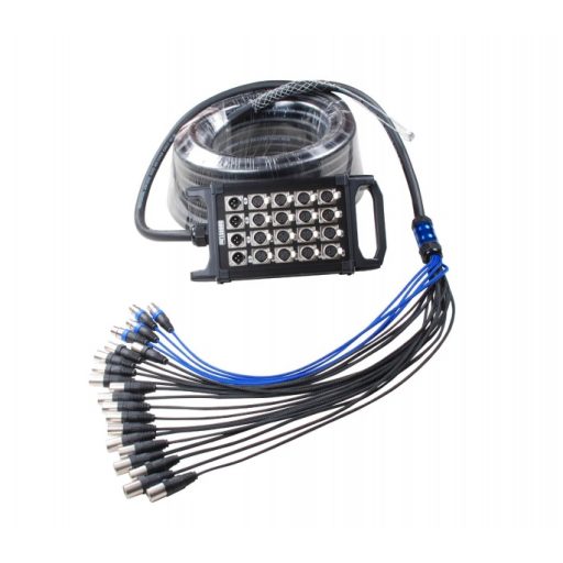 A kiváló minőségű, hajlékony csoportkábel egy tömszelencén keresztül fixen kapcsolódik a dobozhoz, másik végén XLR csatlakozóval szerelt legyezőben végződik. A legyező kifejtési pontját fém burkolat, a legyező minden szálát kábelvédő harisnya, a csatlakozókat acél tehermentesítő védi a sérülésektől. A csatornák azonosítását a kábel mindkét végen elhelyezett számozás segíti.
