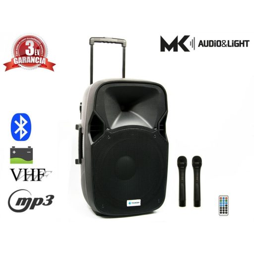 A Thunder Audio akkumulátoros hangfal sorozatnak négy tagja van: ACCU-8 (20 cm), ACCU-10 (25 cm), ACCU-12 (30 cm), ACCU-15 (38 cm). A gyártó folyamatosan figyelmemmel követi a felhasználók igényeit, elvárásait és ehhez mérten alakítják a hangfalakat. Megbízhatósága miatt mára már a legnépszerűbb műanyag akkumulátoros aktív hangfalcsalád lett. Számos korszerű mérnöki megoldás figyelhető meg rajta. A gombok, potméterek süllyesztettek , így háton szállítva sem tudnak sérülni, letörni. Fogantyúja lehetővé teszi a döntést, így félig döntött állapotban, monitor hangfalként is használható. Beépített akkumulátora normál felhasználás mellett 10-15 óra folyamatos használatot tesz lehetővé egy töltéssel. Külső akkumulátor bemenettel rendelkezik, ahová bármilyen 12v-os akkumulátor köthető vagy akár autónk szivargyújtójáról is tudjuk üzemeltetni. A hangszórója nagyon érzékeny, jó minőségű, így meglepően nagy hangerő leadására képes, hangképét telt mélyek és igényes magas hangok jellemzik. Az erősítő teljes körű védelemmel van ellátva, nem lehet túlhajtani, túlfűteni. A termék beépített USB/SD MP3 lejátszóval, FM rádióval rendelkezik, képes pendrive-ról MP3 zenék lejátszására, valamint akár felvétel készítésére is. A lejátszó egyben BLUETOOTH vevő is, amire akár laptoppal, akár mobiltelefonnal tudunk csatlakozni. A Bluetooth kapcsolat segítségével megoldható, hogy a telefonunkon lejátszott zene kábeles kapcsolat nélkül szólaljon meg a hangfalon. A Bluetooth hatótávolsága 10-15 méter. A lejátszóhoz távvezérlő is tartozik, mellyel számos funkció állítható (zenék léptetése, hangerő, ki-be kapcsolás, némítás, stb.) A gyártó két vezeték nélküli kézi mikrofont is ad a termék mellé, melyek vevője a hangfalba van építve. A mikrofonok kifejezetten jó minőségűek, hatótávolságuk 15-20m. Külső mikrofon/hangszer bemenetet, valamint RCA vonalbemenetet is találunk rajta, ahová számítógép, telefon, vagy bármilyen egyéb lejátszóeszköz köthető. A bemenetek hangereje külön-külön szabályozható. Viszonylag kis tömegének köszönhetően könnyedén szállítható. Beépített állványhüvellyel rendelkezik így akár állványra téve, is használható. A kedvező műszaki tulajdonságok mellett a láda esztétikailag is megfelel a kor elvárásainak, modern külsejével bármilyen környezetbe beilleszthető. Ajánlani tudjuk tánc oktatóknak, edzőknek, karaoke felhasználóknak, és minden olyan felhasználónak, akinek egy könnyű, könnyen szállítható, de színvonalas hangtechnikára van szüksége.