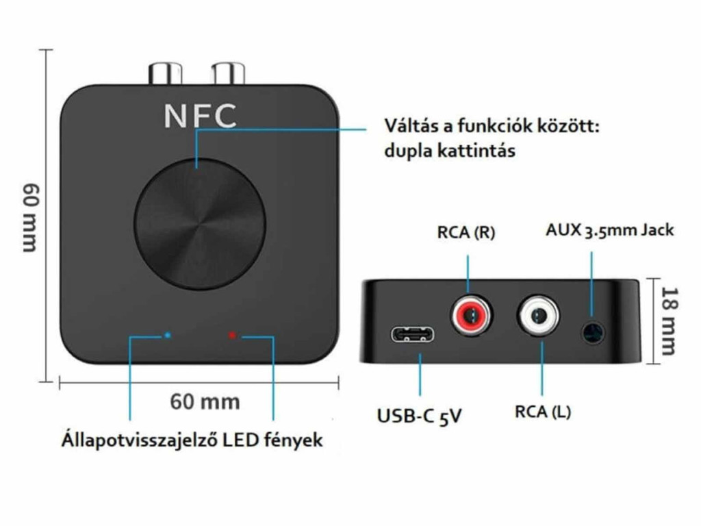 – Tápellátás: DC 5V (USB-C – USB-A csatlakozón)