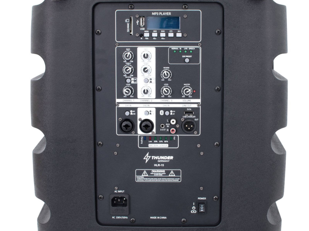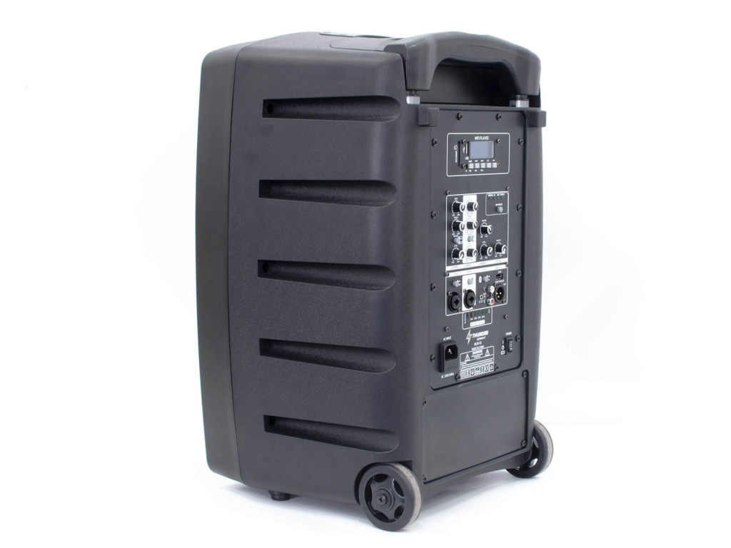 A Thunder Germany folyamatosan figyelmemmel követi a felhasználók igényeit, elvárásait és ehhez mérten alakítják a hangfalakat. Megbízhatósága miatt mára már a legnépszerűbb műanyag akkumulátoros aktív hangfalcsalád lett. Számos korszerű mérnöki megoldás figyelhető meg rajta. A gombok, potméterek süllyesztettek , így háton szállítva sem tudnak sérülni, letörni. Beépített akkumulátora normál felhasználás mellett kb. 12 óra folyamatos használatot tesz lehetővé egy töltéssel. A hangszórója nagyon érzékeny, jó minőségű, így meglepően nagy hangerő leadására képes, hangképét telt mélyek és igényes magas hangok jellemzik. Az erősítő teljes körű védelemmel van ellátva, nem lehet túlhajtani, túlfűteni. A termék beépített USB/SD MP3 lejátszóval, FM rádióval rendelkezik, képes pendrive-ról MP3 zenék lejátszására. A lejátszó egyben BLUETOOTH vevő is, amire akár laptoppal, akár mobiltelefonnal tudunk csatlakozni. A Bluetooth kapcsolat segítségével megoldható, hogy a telefonunkon lejátszott zene kábeles kapcsolat nélkül szólaljon meg a hangfalon. A Bluetooth hatótávolsága 10-15 méter. A lejátszóhoz távvezérlő is tartozik, mellyel számos funkció állítható (zenék léptetése, hangerő, ki-be kapcsolás, némítás, stb.) A gyártó két vezeték nélküli kézi mikrofont is ad a termék mellé, melyek vevője a hangfalba van építve. A mikrofonok kifejezetten jó minőségűek, hatótávolságuk 15-20m. Külső mikrofon/hangszer bemenetet, valamint RCA vonalbemenetet is találunk rajta, ahová számítógép, telefon, vagy bármilyen egyéb lejátszóeszköz köthető. A bemenetek hangereje külön-külön szabályozható. Viszonylag kis tömegének köszönhetően könnyedén szállítható. Beépített állványhüvellyel rendelkezik így akár állványra téve, is használható. A kedvező műszaki tulajdonságok mellett a láda esztétikailag is megfelel a kor elvárásainak, modern külsejével bármilyen környezetbe beilleszthető. Ajánlani tudjuk tánc oktatóknak, edzőknek, karaoke felhasználóknak, és minden olyan felhasználónak, akinek egy könnyű, könnyen szállítható, de színvonalas hangtechnikára van szüksége.