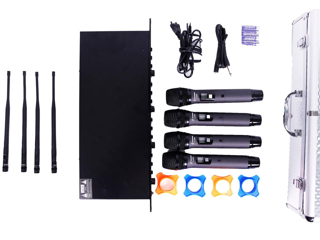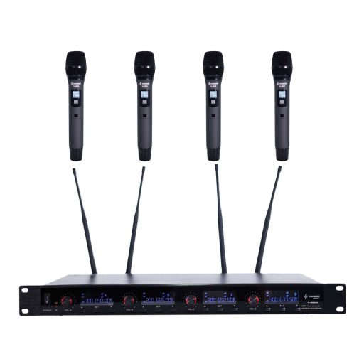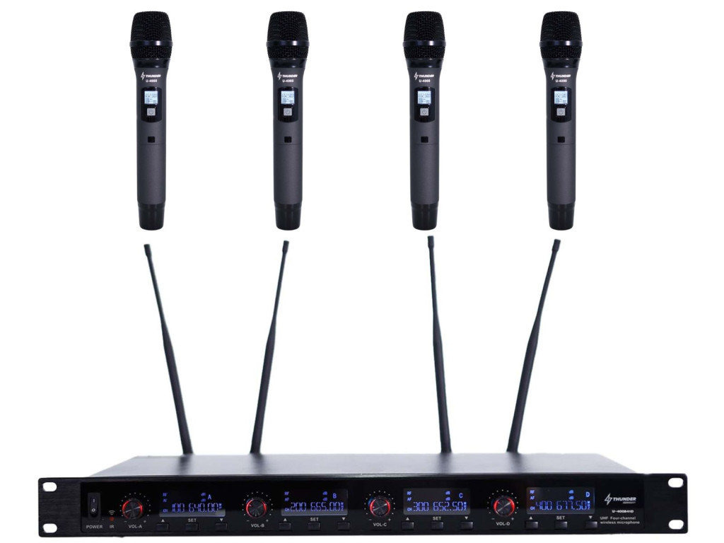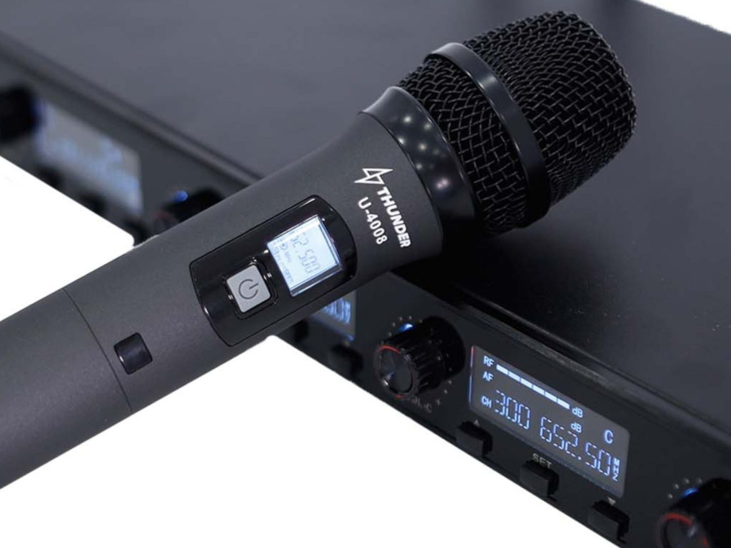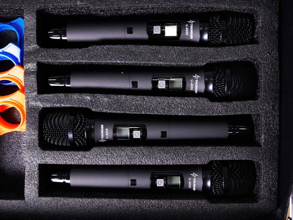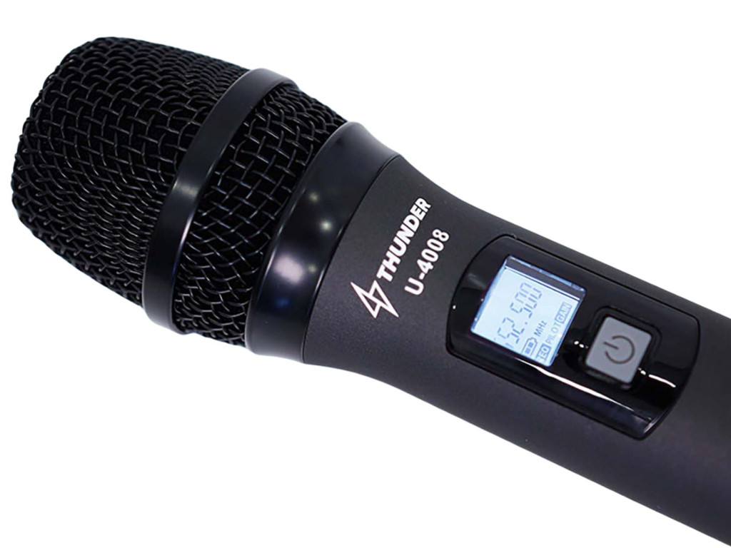 A Thunder U-4008 4ND UHF mikrofon szett tartalmaz 4 db kézi mikrofont, 1 db vevőegységet, 1 db Jack-Jack kábelt, elemeket valamint egy gyári fém tároló koffert. A vevő előlapján egy grafikus kijelző kapott helyet, melyen egyszerűen beállítható a mikrofonok csatornája és a frekvenciája valamint jelzi az RF szintet, AF szintet. A vevő 200 különböző frekvenciájú csatornával rendelkezik. Hatótávolsága 150m nyílt terepen, de épületen belül falak között is tökéletesen használható. Profi minőség, torzítások és zavarok nélkül. Előnye a típusnak, hogy a vevőegység 12v bemenettel rendelkezik, így nem csak 220v-ról használható, hanem akár autó szivargyújtóról vagy bármilyen 12v-os forrásról, akkumulátorról üzemeltethetjük. A vevőn a négy mikrofon hangereje külön-külön szabályozható az előlapon található potméter segítségével. Kiemelendő még ebben a típusban az automatikus IR frekvenciaválasztás, amely gyorsabbá és teljesen hibamentessé teszi a rendszert. A vevőegységen beállított frekvenciára egy gombnyomás után automatikusan átáll az IR sugarába tartott mikrofon. A termék abszolút a profi kategóriába sorolható, nagyon jók a vele kapcsolatos visszajelzések. UHF frekvencián üzemelő mikrofonként nemcsak a rádió átvitel kiváló, de a mikrofonok minősége is lehetővé teszi a komolyabb felhasználást. A mikrofon messze felülmúlja más gyártók hasonló árkategóriájú mikrofonjait, ez valóban profi kategória, amely zenekarokban, hangosításokon is megállja helyét.