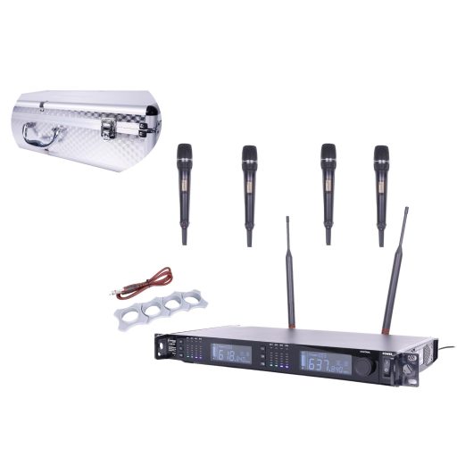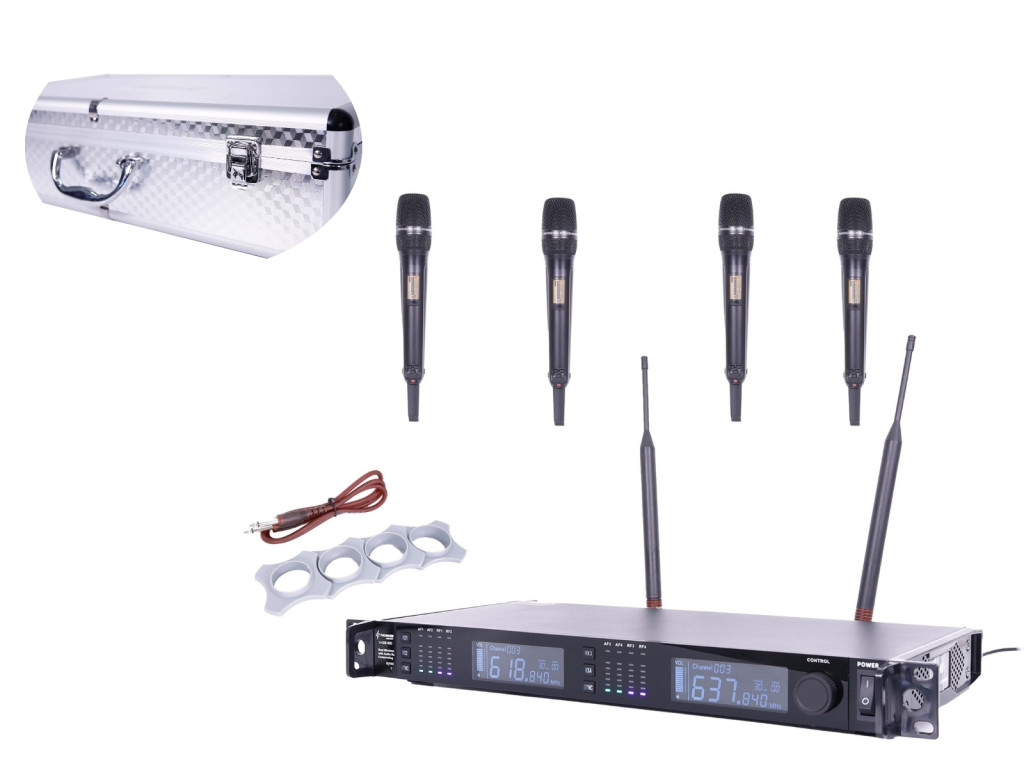 A Thunder U-4308 4ND UHF mikrofon szett tartalmaz 4 db kézi mikrofont, 1 db vevőegységet, 1 db Jack-Jack kábelt, elemeket valamint egy gyári fém tároló koffert. A vevő előlapján egy komolyabb, grafikus kijelző kapott helyet, melyen egyszerűen beállítható a mikrofonok csatornája és a frekvenciája valamint jelzi az RF szintet, AF szintet és a mikrofon töltöttségi állapotát is. A vevő 160 különböző frekvenciájú csatornával rendelkezik. Hatótávolsága 200m nyílt terepen, de épületen belül falak között is tökéletesen használható. Profi minőség, torzítások és zavarok nélkül. Előnye a típusnak, hogy a vevőegység 12v bemenettel rendelkezik, így nem csak 220v-ról használható, hanem akár autó szivargyújtóról vagy bármilyen 12v-os forrásról, akkumulátorról üzemeltethetjük. A vevőn a négy mikrofon hangereje külön-külön szabályozható az előlapon található potméter segítségével. Kiemelendő még ebben a típusban az automatikus IR frekvenciaválasztás, amely gyorsabbá és teljesen hibamentessé teszi a rendszert. A vevőegységen beállított frekvenciára egy gombnyomás után automatikusan átáll az IR sugarába tartott mikrofon. A termék abszolút a profi kategóriába sorolható, nagyon jók a vele kapcsolatos visszajelzések. UHF frekvencián üzemelő mikrofonként nemcsak a rádió átvitel kiváló, de a mikrofonok minősége is lehetővé teszi a komolyabb felhasználást. A mikrofon messze felülmúlja más gyártók hasonló árkategóriájú mikrofonjait, ez valóban profi kategória, amely zenekarokban, hangosításokon is megállja helyét.