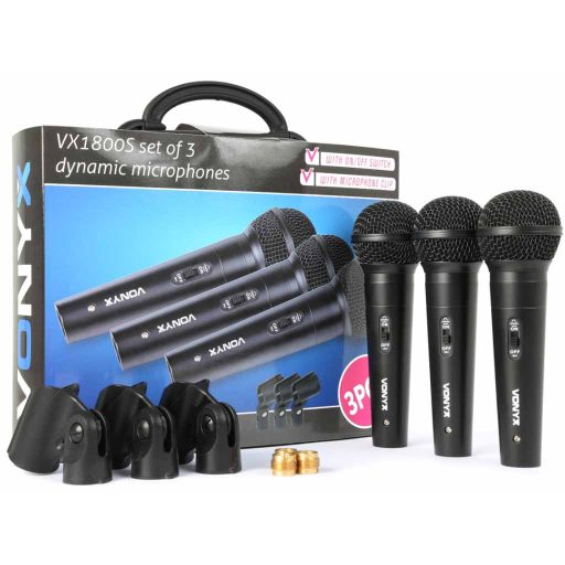 Vonyx VX1800S három darab igényes kialakítású mikrofont tartalmaz. Árkategóriájában jó hangminőség jellemzi, nem gerjed, kellemes, élethű hangokat hallunk vissza a hangfalban. A termékhez gyárilag jár egy műanyag koffer amelyben könnyedén szállíthatjuk valamint jár még hozzá 3db mikrofon kengyel is.A mikrofont ajánljuk minden olyan felhasználónak aki egy olcsó, de mégis jó minőségű mikrofonra vágyik. Ideális karaoke felhasználásra, discokba, zenekaroknak és hangosítóknak egyaránt.